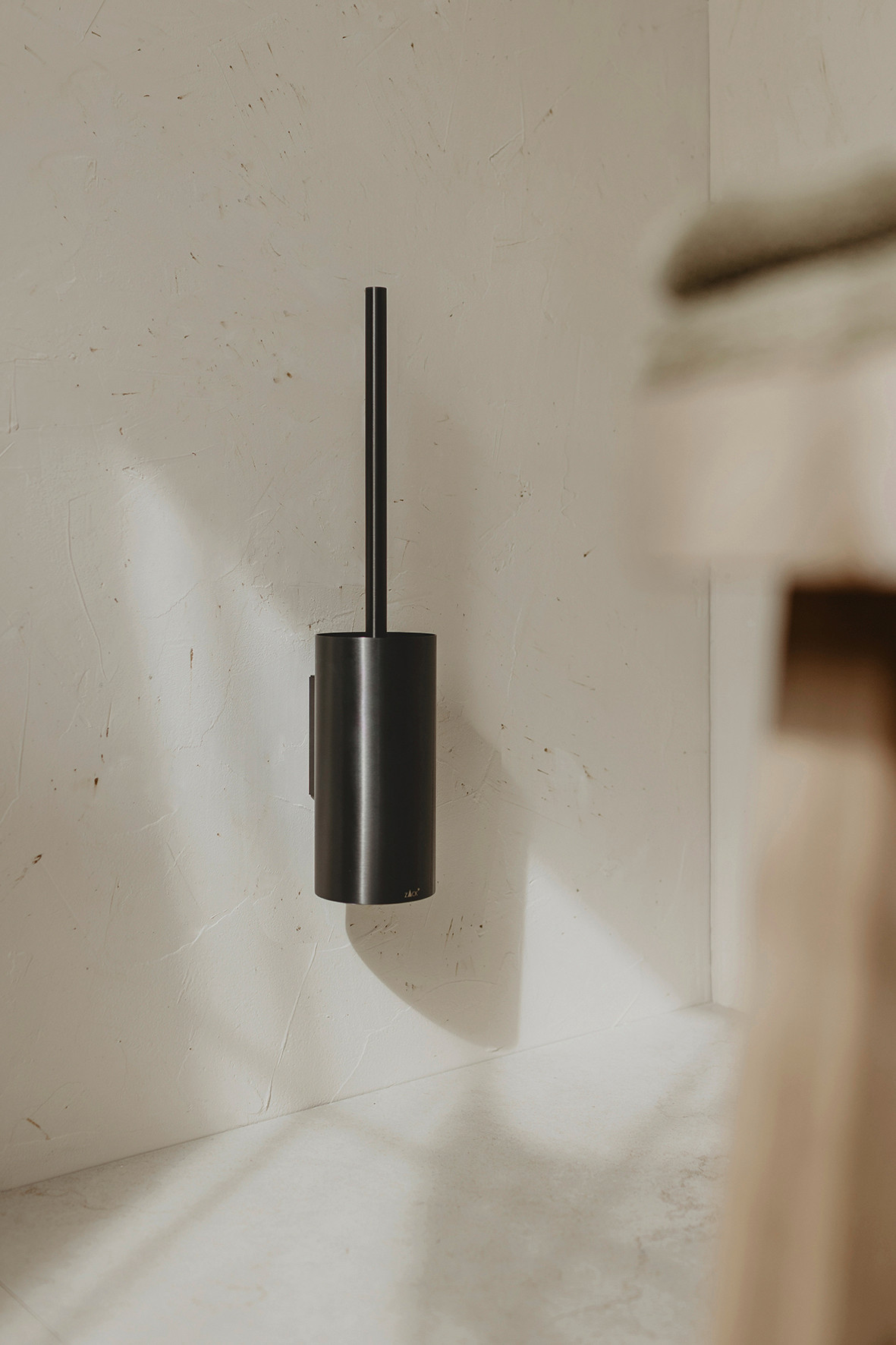 Brosse pour toilettes avec réceptacle, sur son support mural, en inox 18/10 de gamme.