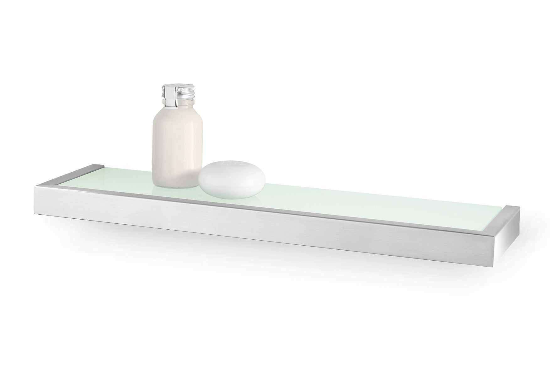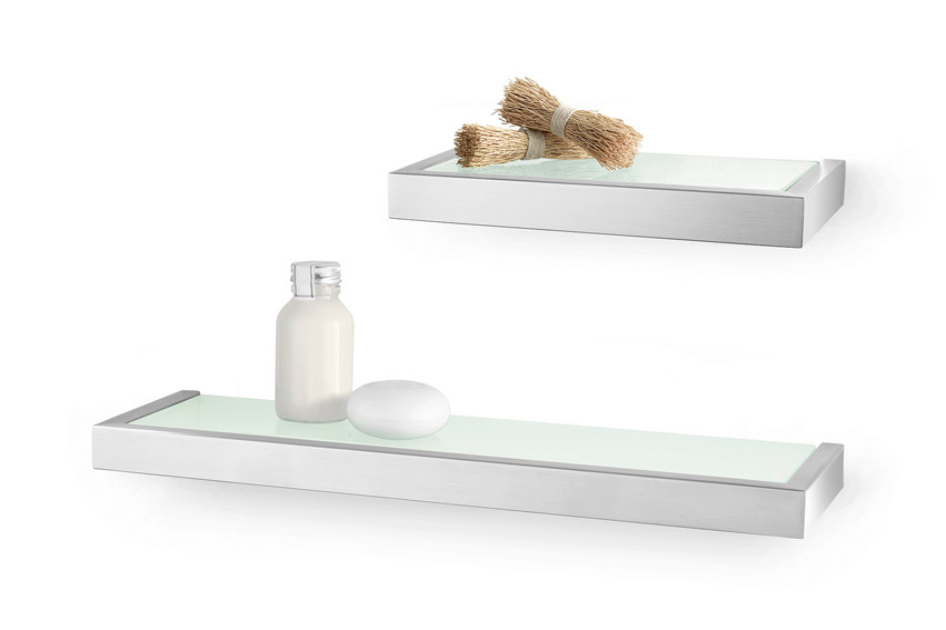 Supports en Inox brossé avec tablette en verre mat trempé. Disponibles en 3 longueurs.